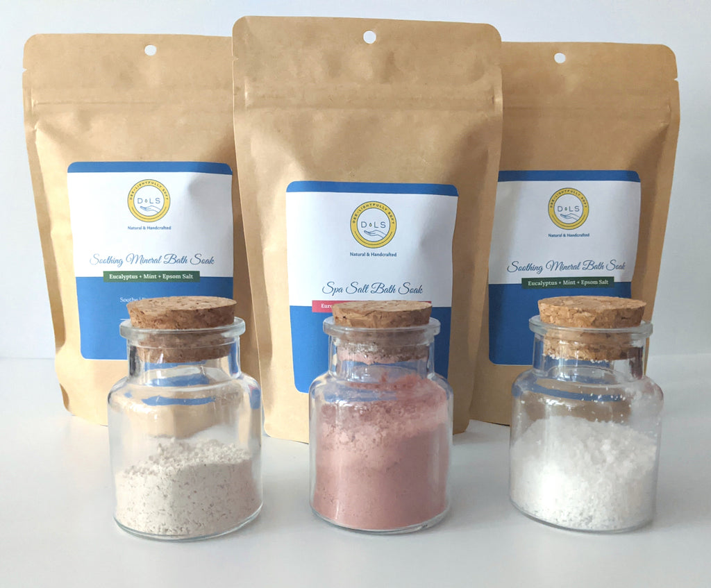 Epsom Salt (Magnesium Sulfate), Sea Salt (Sodium Chloride), Baking Soda (Sodium Bicarbonate), Dendritic Salt (Sodium Chloride), Dead Sea Salt, Tapioca Starch, Clay, Eucalyptus Leaf Oil, Lavender (Lavandula Angustifolia) Flower Oil*, Peppermint (Mentha Piperita) Leaf Oil*